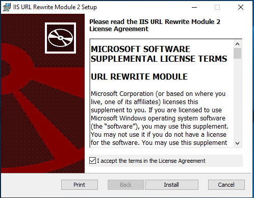 11. After installation is finished, package installs the **IIS URL Rewrite Module**. To install this module **Accept the License Agreement** and click **Install**.