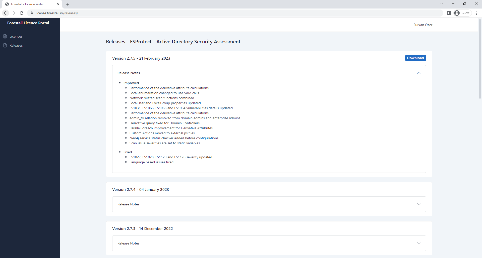 3. Download the installation package of last release from [**Releases** ](https://license.forestall.io/releases/)page.