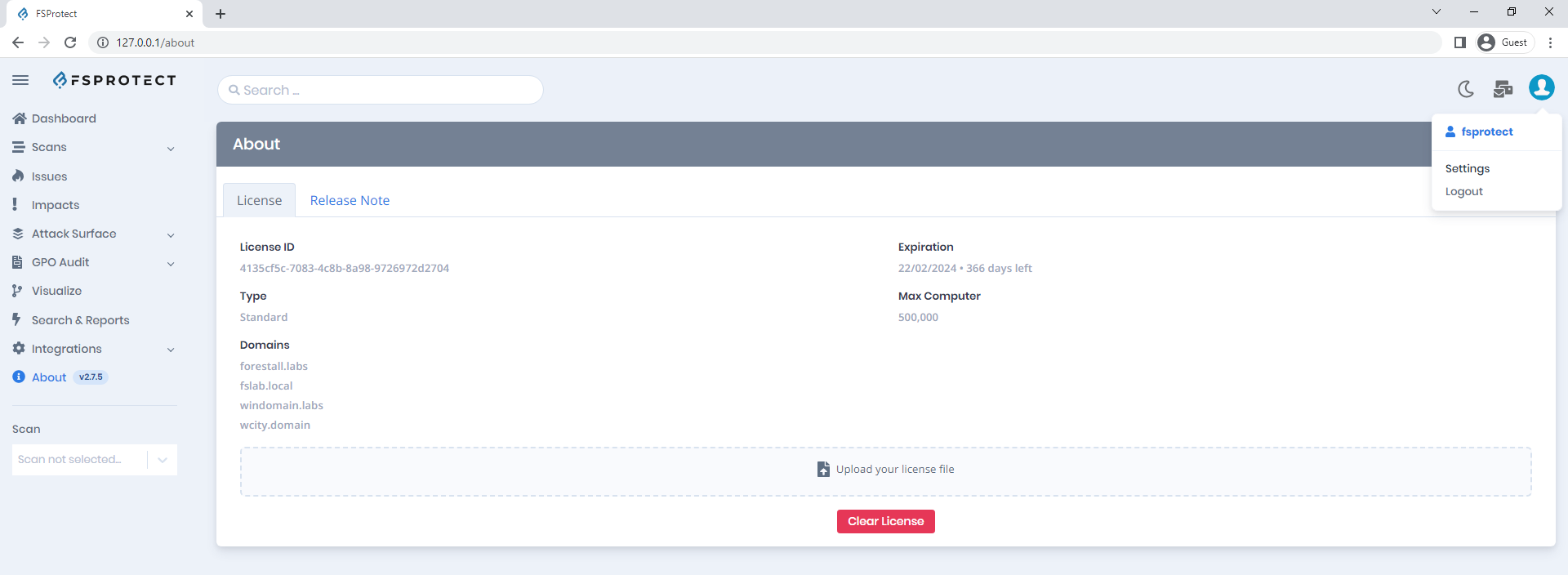 14. After the logging in web interface automatically redirects to the **About > License** page. You need to import License file to start a scan.