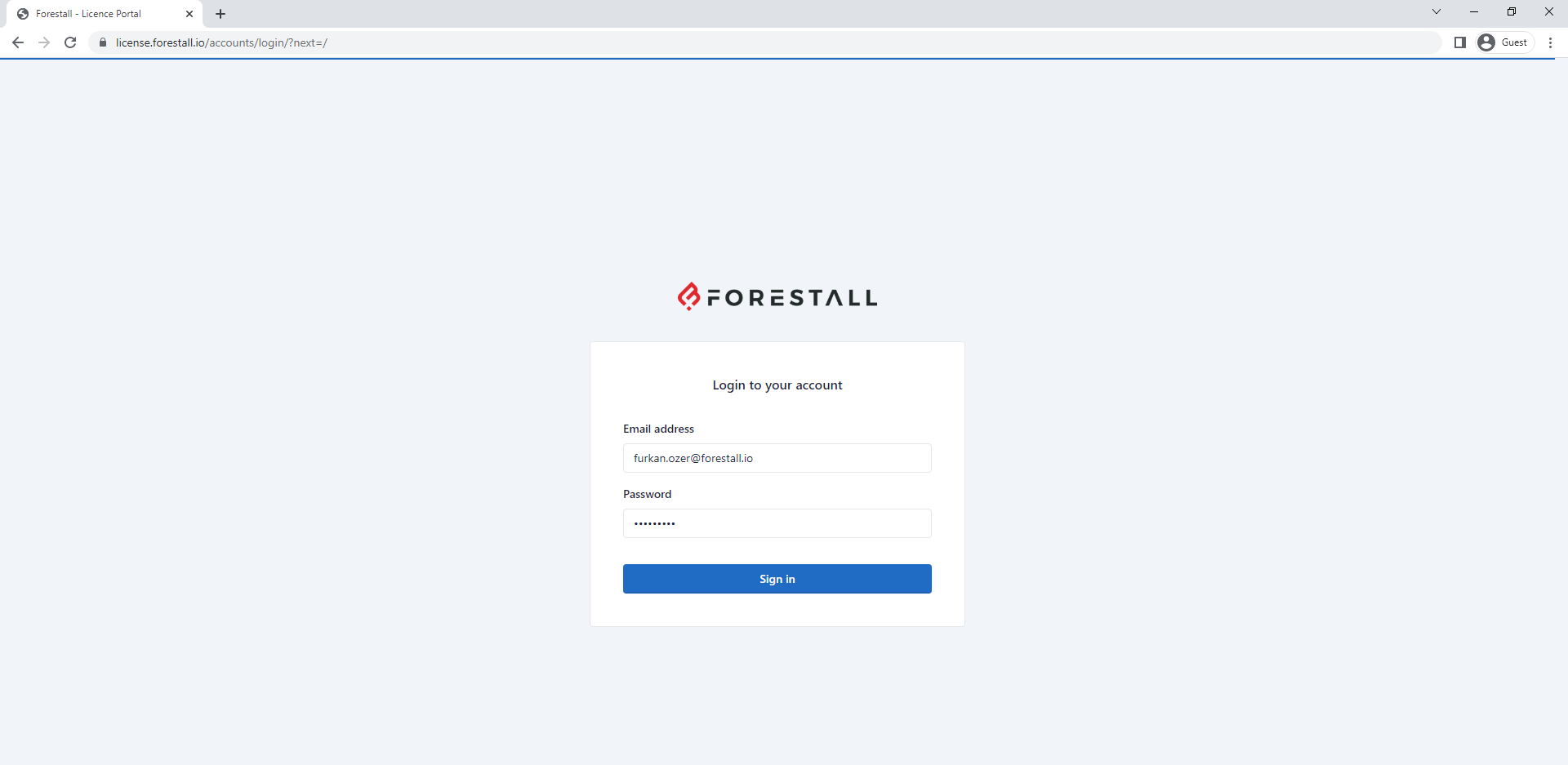 1. Log in the [**license.forestall.io**](https://license.forestall.io/) with given credentials.