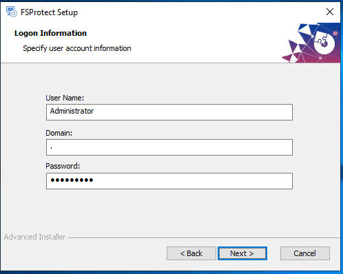 8. Enter the **Username**, **Domain**, and **Password** of a user that manages FSProtect services. This user must be a local admin for non domain-joined machines.